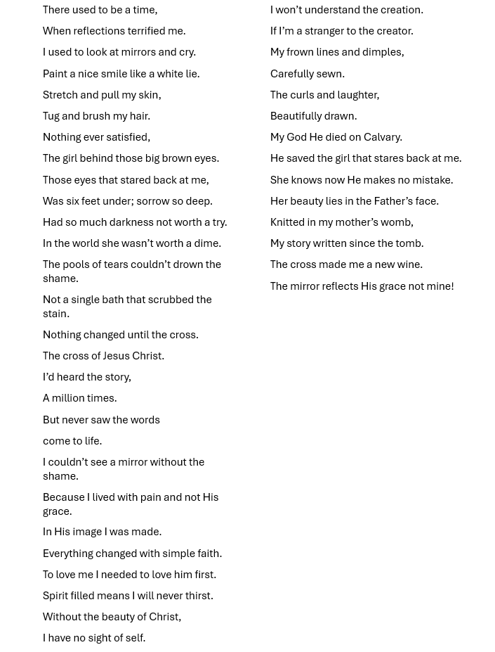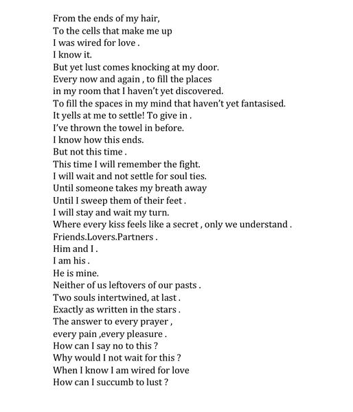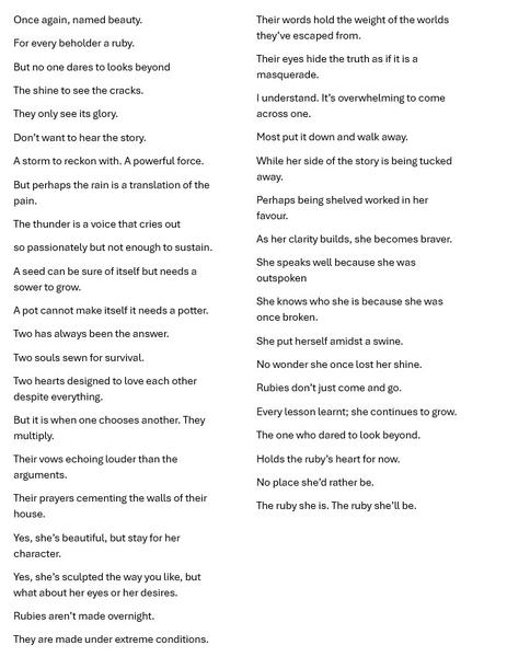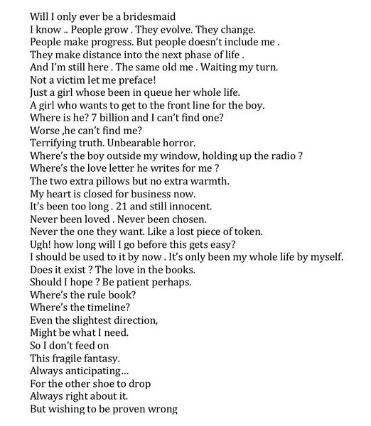 Ever since I was a little girl , I was always complimented on my articulation. Overtime my love for words grew into something beautiful. I write poems to navigate my everyday emotions . It connects me to others and myself.
